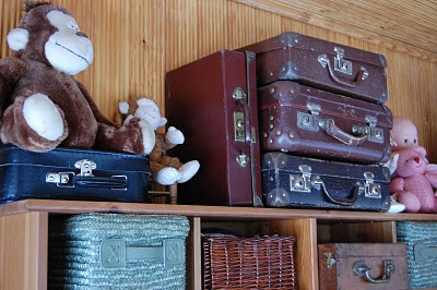 Verannan leluhyllyn lasten kokoisten matkalaukkujen kokoelmani kertyy pikkuhiljaa. Jotenkin ne ovat niin suloisia, että yleensä ne mukaani lähtevät jos kirpparihyllyltä sellainen löytyy. Niihin on kätevä säilöä esim. poikien tumppuja ja pipoja kesäksi. Pitäisi löytää niihin vielä sellaisia vanhoja osoitekylttejä roikkumaan, mihin voisi kirjoittaa, mitä laukku sisältää.